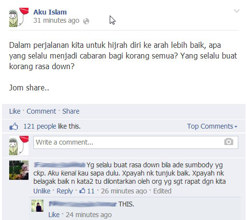 Mungkin, perkara ini normal dalam masyarakat kita bila kita ingin melakukan sesuatu perubahan yang ke arah lebih baik itu, pasti ada yang akan memandang serong dan memperlekehkan usaha kita itu serta sentiasa menjatuhkan semangat kita.