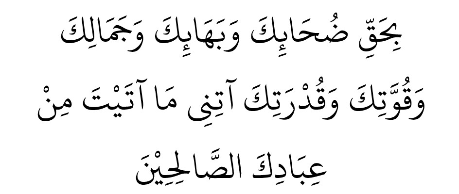 Bihaqqi dhuhaa ika wabahaa ika wajamaalika waquwwatika waqudrotika aatini maa ataita min ‘ibaadikassolihiin