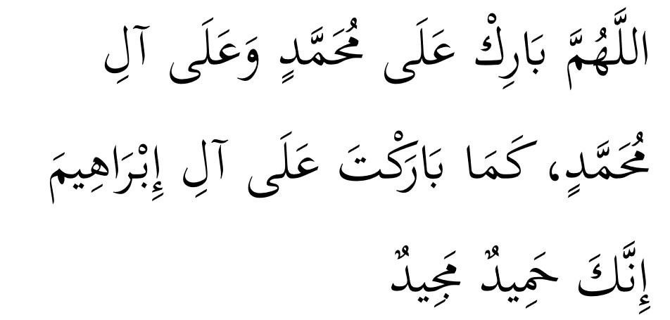 Ya Allah berilah selawat kepada Muhammad dan kepada keluarga Muhammad sebagaimana Engkau telah berselawat kepada Ibrahim dan keluarga Ibrahim, Sesungguhnya Engkau Maha Terpuji (lagi) Maha Mulia. Ya Allah, Berkatilah Muhammad dan keluarga Muhammad sebagaimana Engkau telah memberkati Ibrahim dan keluarga Ibrahim, sesungguhnya Engkau Maha Terpuji (lagi) Maha Mulia.”