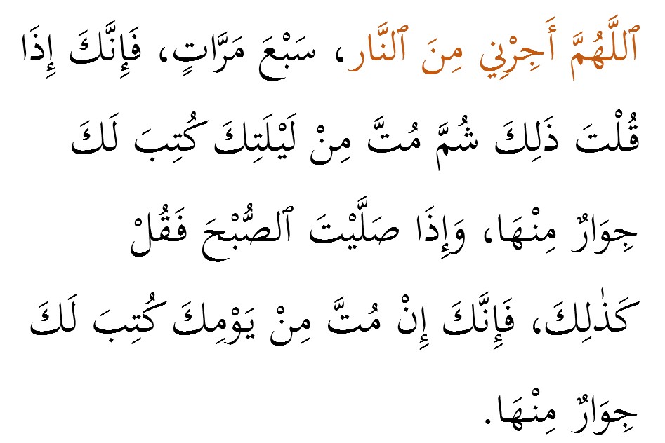 โYa Allah, lindungilah aku daripada api nerakaโ sebanyak 7 kali. Sesungguhnya apabila engkau mengucapkannya kemudian engkau mati malam itu, engkau pasti dilindungi daripada neraka. Dan ucapkan juga selepas solat subuh. Sesungguhnya jika engkau mengucapkan kemudian engkau mati pada hari itu, engkau pasti dilindungi daripada neraka (Riwayat Abu Daud)
