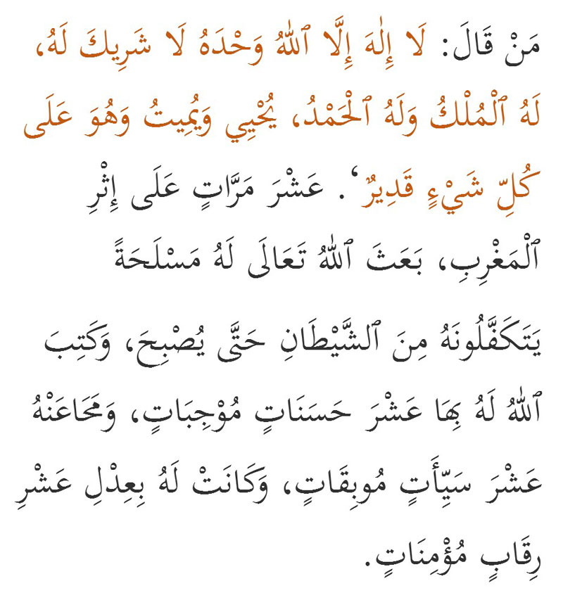 Siapa yang membaca, โTiada tuhan yang patut disembah selain Allah semata yang tiada sekutu bagiNya. MilikNya segala kerajaan dan bagiNya segala pujian. Dia Maha Menghidupkan lagi Maha Mematikan, dan Dia Maha Kuasa atas segala sesuatuโ sebanyak 10 kali selepas Maghrib, pasti Allah akan mengirimkan sepasukan malaikat bersenjata yang menjaganya daripada syaitan sehingga pagi hari, Allah akan memberikan 10 pahala yang menghantarnya ke syurga, menghapuskan 10 dosa yang mencelakakannya, dan bacaan itu sama nilainya dengan memerdekakan 10 orang hamba mukmin.